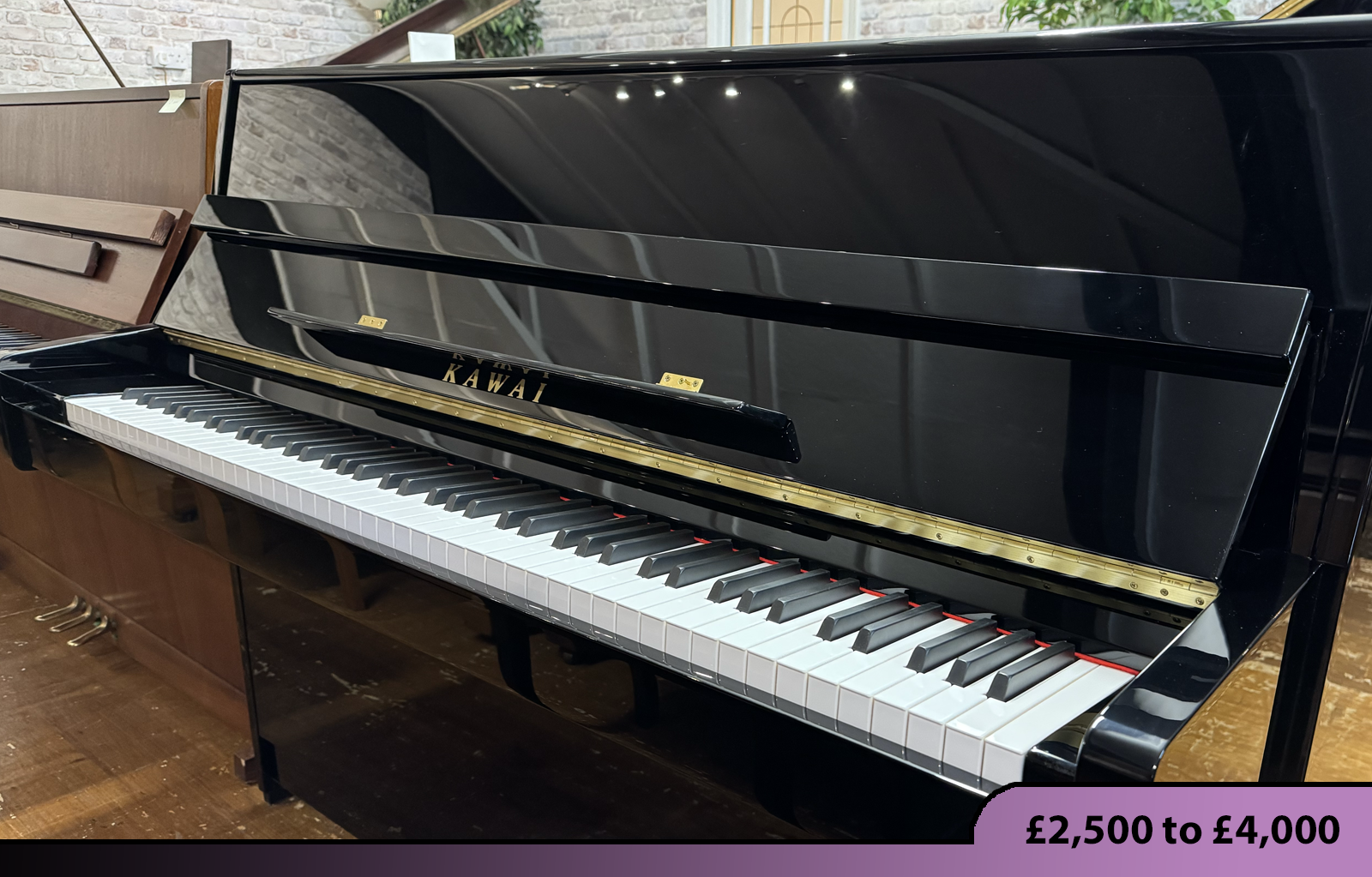 Beautiful example of the Kawai K15 upright piano in black polyester finish.